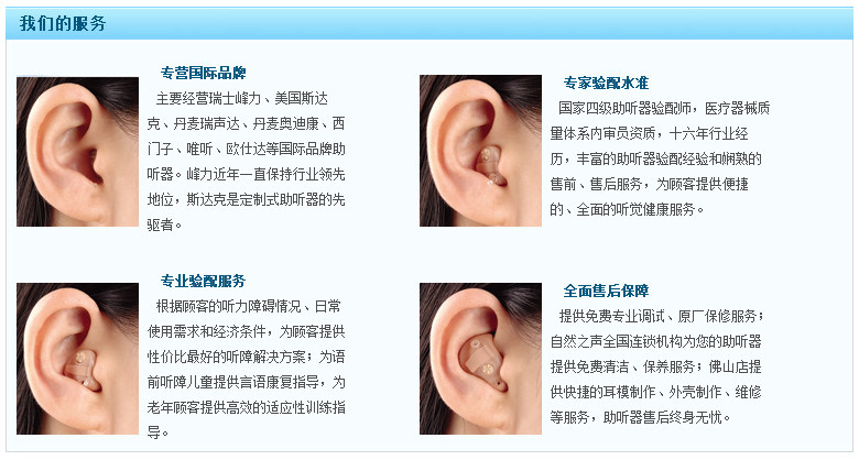 本公司是自然之声听力全国连锁机构特约加盟店,专营高品质助听器,包含美国斯达克、瑞士峰力、丹麦奥迪康、丹麦瑞声达等国际一流助听器品牌,为不同地区的广大听障人士提供专业的、全面的、便捷的听觉健康服务。